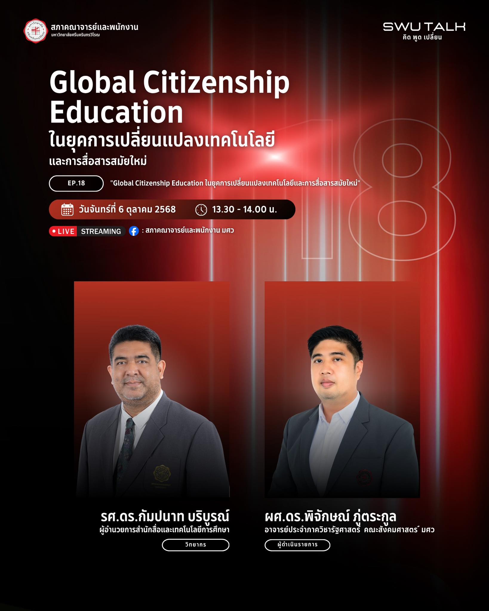 Anirut S / Monday, October 6, 2025 / Categories: SWU Talk คิด พูด เปลี่ยน SWU Talk คิด พูด เปลี่ยน EP. 18 Global Citizenship Education ในยุคการเปลี่ยนแปลงเทคโนโลยี และการสื่อสารสมัยใหม่ วันจันทร์ที่ 6 ตุลาคม 2568 เวลา 13.30 - 14.00 น. สภาคณาจารย์และพนักงาน มหาวิทยาลัยศรีนครินทรวิโรฒ“SWU Talk คิด พูด เปลี่ยน“ EP. 18 Global Citizenship Education ในยุคการเปลี่ยนแปลงเทคโนโลยี และการสื่อสารสมัยใหม่ วันจันทร์ที่ 6 ตุลาคม 2568 เวลา 13.30 - 14.00 น. Previous Article ร่วมงานแสดงกตเวทิตาจิตแด่ผู้เกษียณอายุ ประจำปีพุทธศักราช 2568 เมื่อวันที่ 30 กันยายน 2568 Print 9